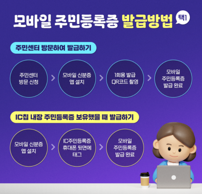 모바일 주민등록증 발급방법은 주민센터 방문 발급과 IC칩 내장 주민등록증을 활용한 발급으로 나뉩니다.