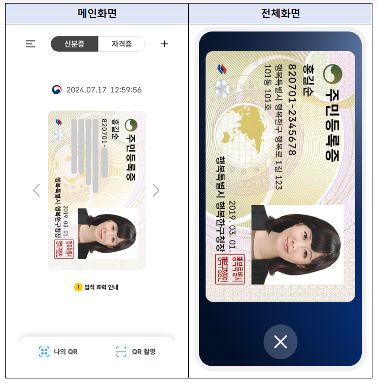 - 발급 완료: QR코드 인증 후 모바일 주민등록증이 활성화됩니다.