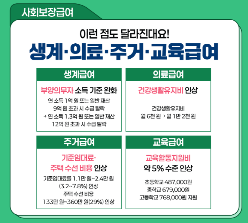 이와 더불어 생계급여, 의료급여, 주거급여, 교육급여 등의 개선된 정책은 사회적 약자들에게 더 나은 지원을 제공할 것입니다. 앞으로도 정부의 이러한 노력이 지속되기를 기대합니다.