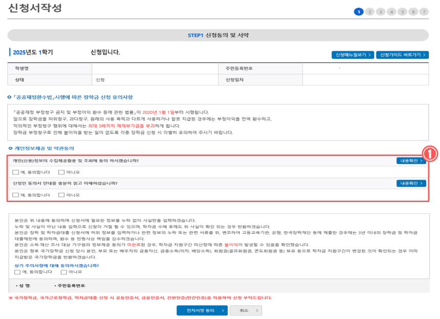 ▶ 장학금 신청 동의 및 서약을 합니다.