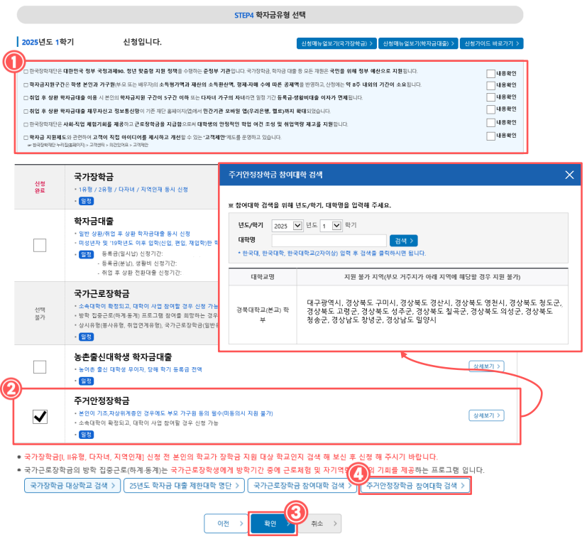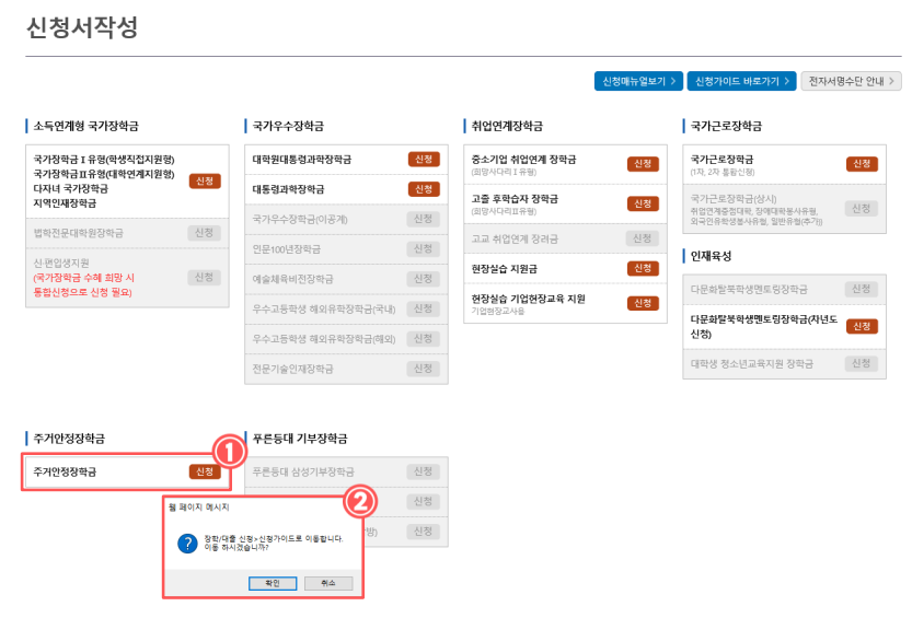 ▶ ‘주거안정장학금’ 항목을 찾아 클릭합니다.(팝업 메뉴가 뜨면 '확인' 버튼 클릭!)