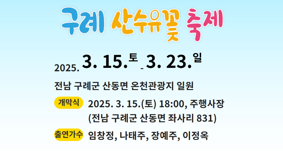 | 구례 산수유꽃축제 | 구례 | 산수유 | 3월 15일 ~ 3월 23일 |