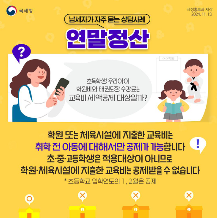 • 초등학교 입학 예정인 자녀의 경우, 입학 연도의 1~2월 지출은 공제 가능합니다.