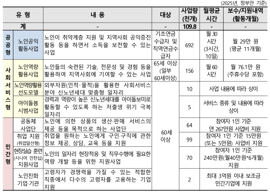 예산 규모: 2025년에는 2조 1,847억 원의 예산이 투입됩니다. 이는 작년 대비 6.8만 개의 추가 일자리를 창출하며, 노인 공익활동, 사회서비스형 일자리, 민간형 일자리 등을 포함합니다.