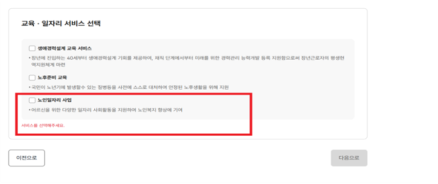 - ⑨ 교육/일자리 서비스 선택 → ⑩ 노인 일자리 사업 선택