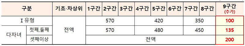 | 9구간 | 50만 원 | 100만 원 | 100만 원 |